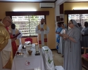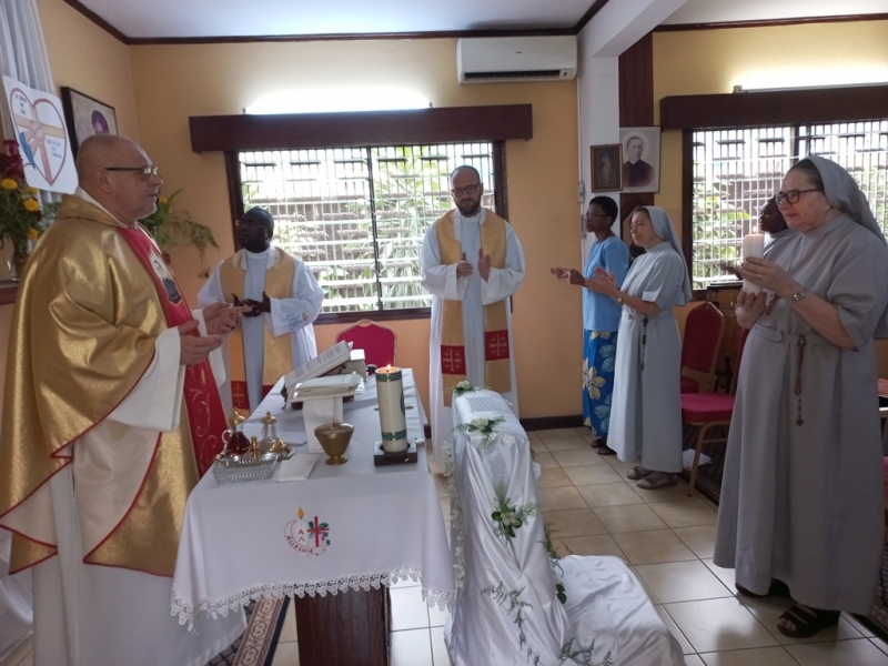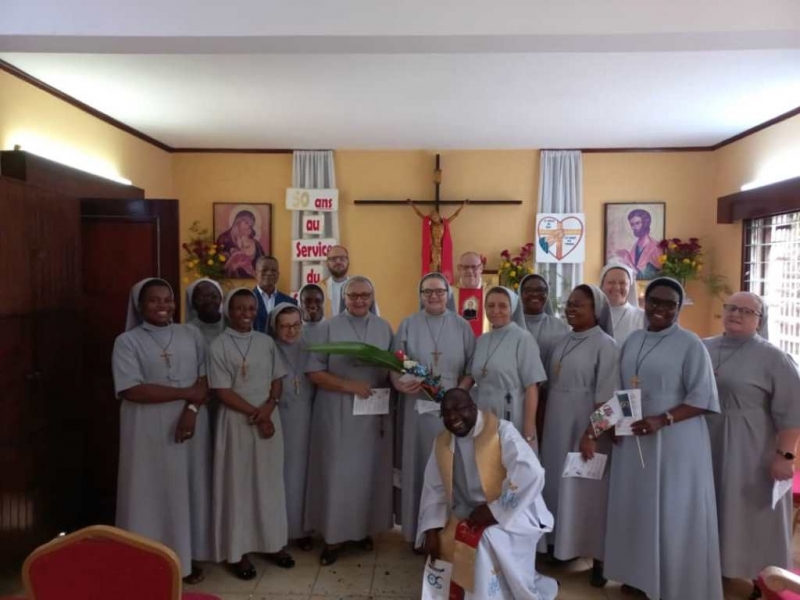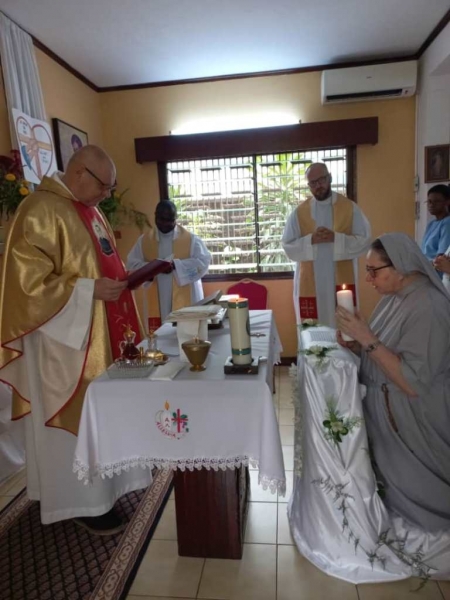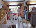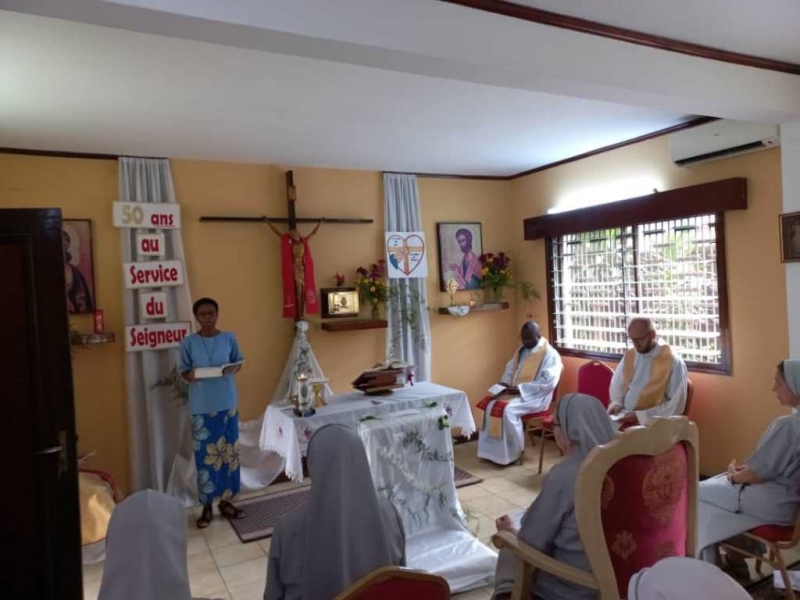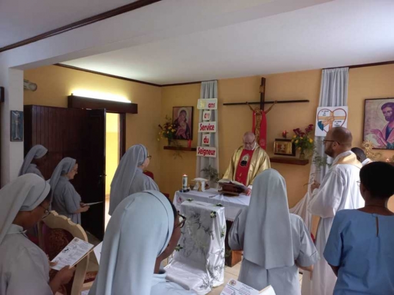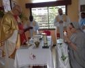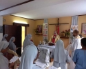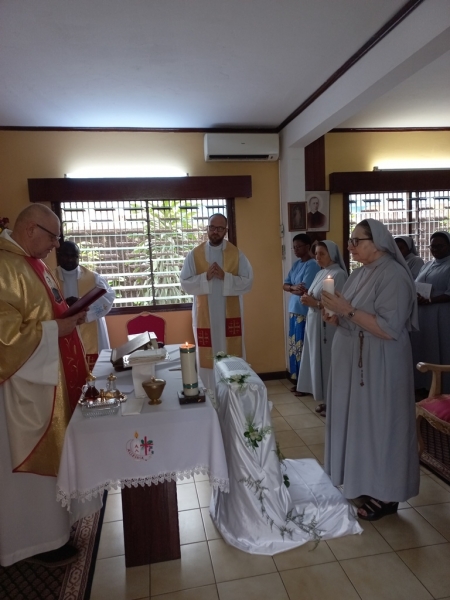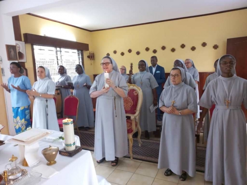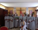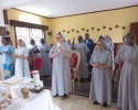 Cała nasza Józeficka Delegatura Afrykańska była złączona duchowo, a najbliższe wspólnoty obecne fizycznie, by razem dziękować Panu za tak wiele łask danych Siostrze Jubilatce za 50 lat jej zakonnego trwania. Siostra Matylda przypomniała nam słowa z Ewangelii św. Marka (15,16): „Idźcie na cały świat i głoście Ewangelię wszelkiemu stworzeniu.” Tak więc, oprócz wyśpiewanego Bogu „Te Deum” za wspaniałość darów i łask, za dar powołania zakonnego Jubilatki, do którego Pan dodał powołanie misyjne, głęboko w naszych sercach brzmiał śpiew: „Jest ziemia do pracy dla Pana, jest naród, aby go uświęcać dla Pana i dziś Pan potrzebuje i powołuje swoich robotników na te żniwa”. Nasza Siostra Jubilatka - skromna, cichutka pragnęła, abyśmy świętowały ten Jubileusz razem i w naszej wspólnocie - i to było piękne! Ze łzą w oku zauważyć można było wzruszenie, kiedy po odnowieniu przez s. Matyldę Profesji zakonnej, nasze młode siostry józefitki otoczyły Ją, aby tańczyć dziękując Bogu za ten kawał życia Jubilatki w Panu i dla Pana. Tak razem , tak po afrykańsku płynęły przed Tron Boży dziękczynienia. Tam – tam, marakass, chorągiewki razem z nami tańczyły dla Pana. W homilii Mszy św. przewodniczący ks. Bogdan Piotrowski proponował Siostrze Jubilatce, aby odnalazła na nowo to pierwsze, pełne MIŁOŚCI spojrzenie Chrystusa, które ją zaprowadziło na drogę pójścia za Nim. Bo w życiu potrzeba nam wracać do tego pierwszego, pełnego Miłości spojrzenia Pana, aby kontynuować miłosne z Nim kroczenie, bo tylko wtedy wszystkie trudności odnajdą sens i wartość….