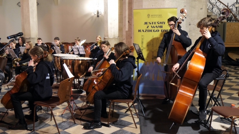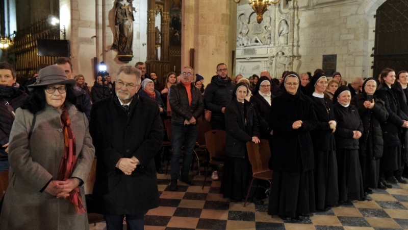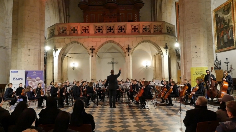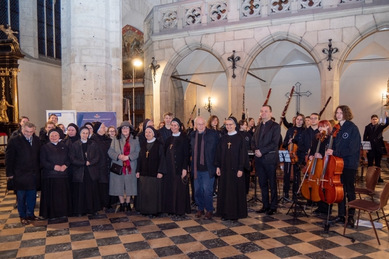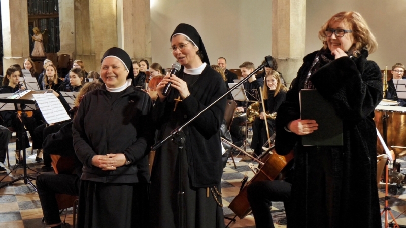 Natomiast p. Leszek Długosz - aktor, literat, kompozytor, pianista – wprowadził zebranych w głębię nietuzinkowych przemyśleń: Bo jeśli to jest i ten czas, że rzeczywiście uda się zbudować nową wspólnotę, prawdziwą więź? To będzie dar Losu? Opatrzności? Niech będzie nazwana jak komu odpowiada ta szansa na całkiem inne, odmienione, jakże szczęśliwsze ułożenia się tu nasze… i w wiersze poetów polskich i ukraińskich od romantyzmu po współczesność. IX symfonię e-moll z Nowego Świata A. Dvoraka i inne utwory zagrała Krakowska Młoda Filharmonia – Orkiestra ZPSMuz im. M. Karłowicza w Krakowie pod batutą Maestro Tomasza Chmiela. Dar wykorzystanych talentów 50-cio osobowej Orkiestry uczynił Koncert jedynym i niepowtarzalnym. Koncert stał się drogą pomocy dla Domu Miłosierdzia w Brzuchowicach i osób potrzebujących we Lwowie. Uczestnicy tego wydarzenia mogli złożyć cegiełkę - dar serc dla potrzebujących na Ukrainie. W imieniu Przełożonej generalnej Sióstr Świętego Józefa m. Wandy podziękowanie złożyła s. Zachariasza CSSJ, a krótkie świadectwo o pracy w Brzuchowicach powiedziała s. Renata CSSJ. Drodzy Artyści! Bóg obdarował Was hojnością swoich darów, przestrzenią serca na czynienie dobra, wrażliwością na drugiego człowieka, na piękno, którego nie przyćmi nawet wojna… czy zegar czasu. Jesteście Ambasadorami Pana Boga dla udręczonej bólem Ukrainie. Jej krzyk dotarł do Waszych uszu, a Wy nie zostaliście obojętni…. W pięknie usłyszanych przed chwilą utworów, w myślach zebranych w poezję, w drzwiach otwartych tego kościoła, przechodzący Bóg w ciele drugiego człowieka wyciąga rękę. I uśmiecha się za drobinę nadziei wlewaną w serca. Za to Wam dziękujemy i gratulujemy Drodzy Uczestnicy Koncertu! Wielu z nas zgromadziło się w tym miejscu w imię miłości i solidarności z Ukrainą. W poszukiwaniu sensu ukrytego za zasłoną niezawinionego cierpienia. Dla chwili zadumy, że On – Bóg jest i że jest Bogiem Zmartwychwstałym!Dziękujemy za dar Waszych Serc.