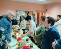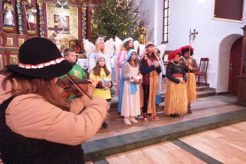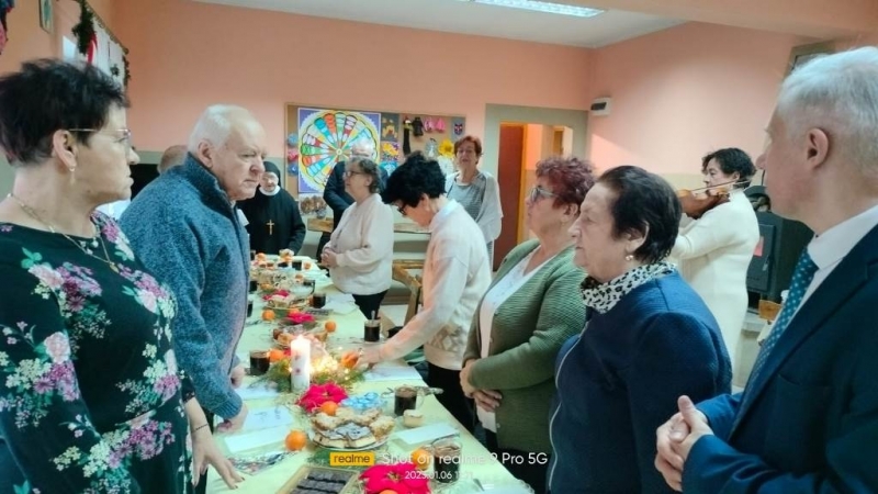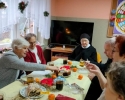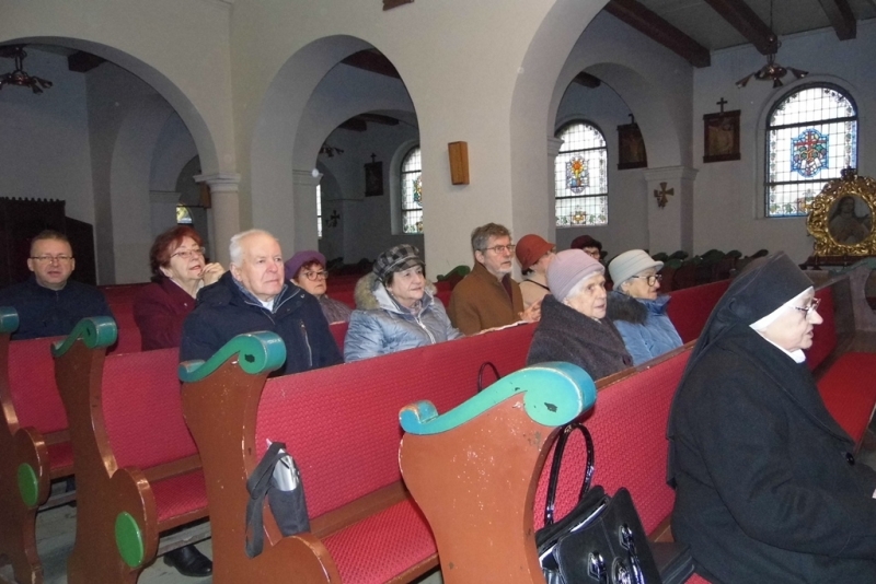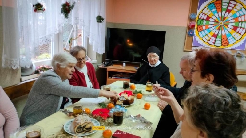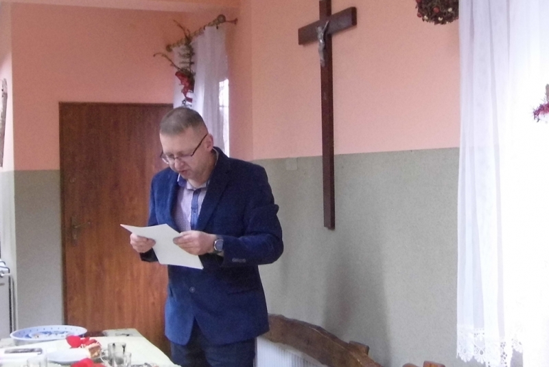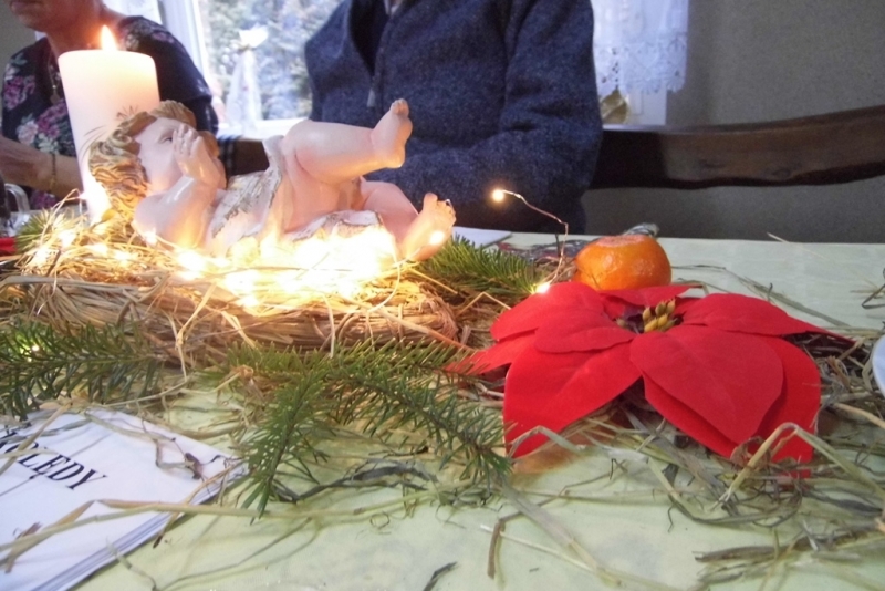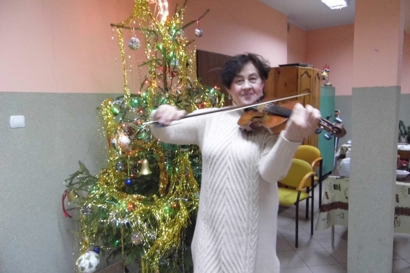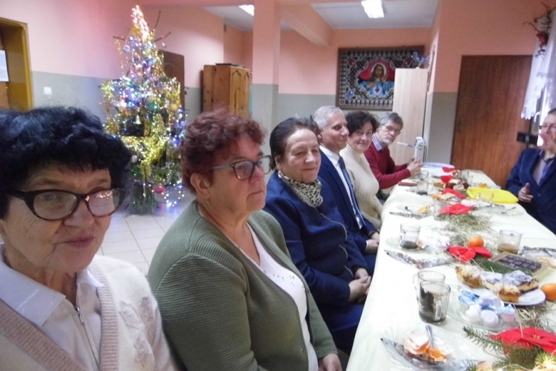 Swoją obecnością zaszczycił nas ks. prob. Jacek Somerski. Po podzieleniu się opłatkiem wysłuchaliśmy życzeń i rozważania Sióstr ze Zgromadzenia Świętego Józefa, które przeczytały panie: Teresa, Aleksandra i Maria. Czytania zakończył pan Marcin. W radosnej atmosferze przy stole trwały rozmowy zakończone śpiewaniem kolęd z akompaniamentem skrzypiec- muzyk pani Alicji.